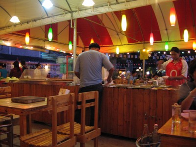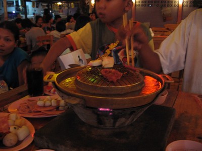 Kuchen. Fleisch, Garnelen usw werden auf den Grill gelegt oder in die heiße