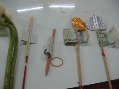Zettel mit eigenem Namen (soll Glück bringen, siehe unten), Geldspenden.