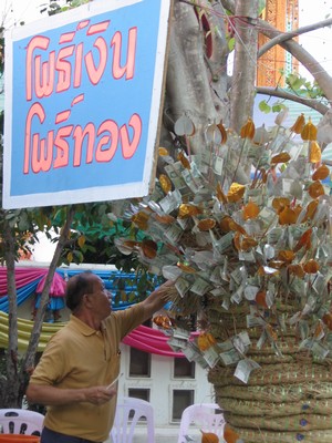 Die Geldspenden werden entweder hier angespießt (rechts) oder an diesen Schnüren (links unten) befestigt und dann hoch in Richtung Tempel gezogen (rechts unten).