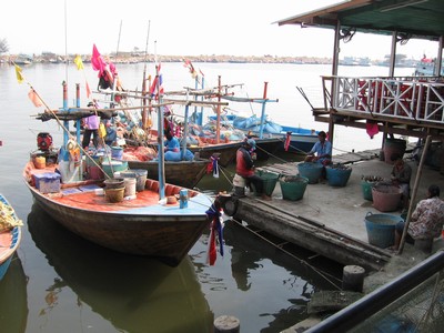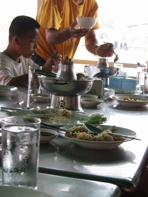 Sen, Tom Yam Suppe, diverse Fische und gebratenen Reis mit Krabben. Für